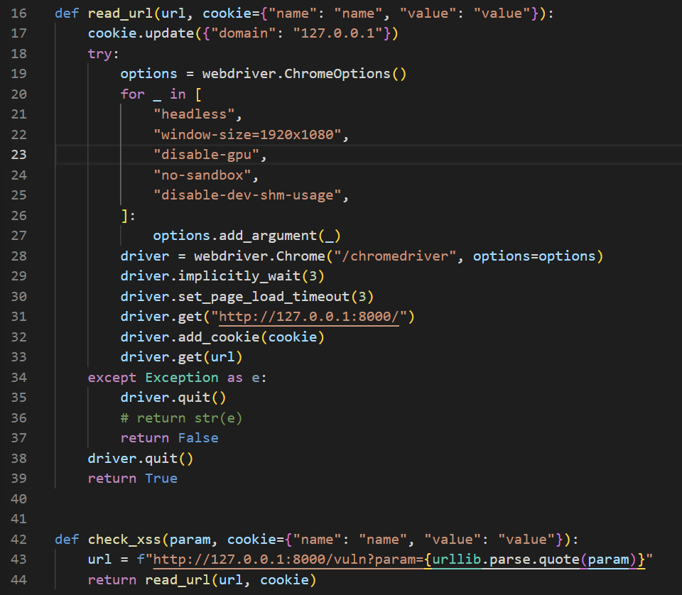31~33) localhost 주소로 접속 후, 전달 받은 cookie 값을 쿠키로 추가하여 인자로 전달 받은 url에 접속한다. 이때 cookie는 flag 값이다.