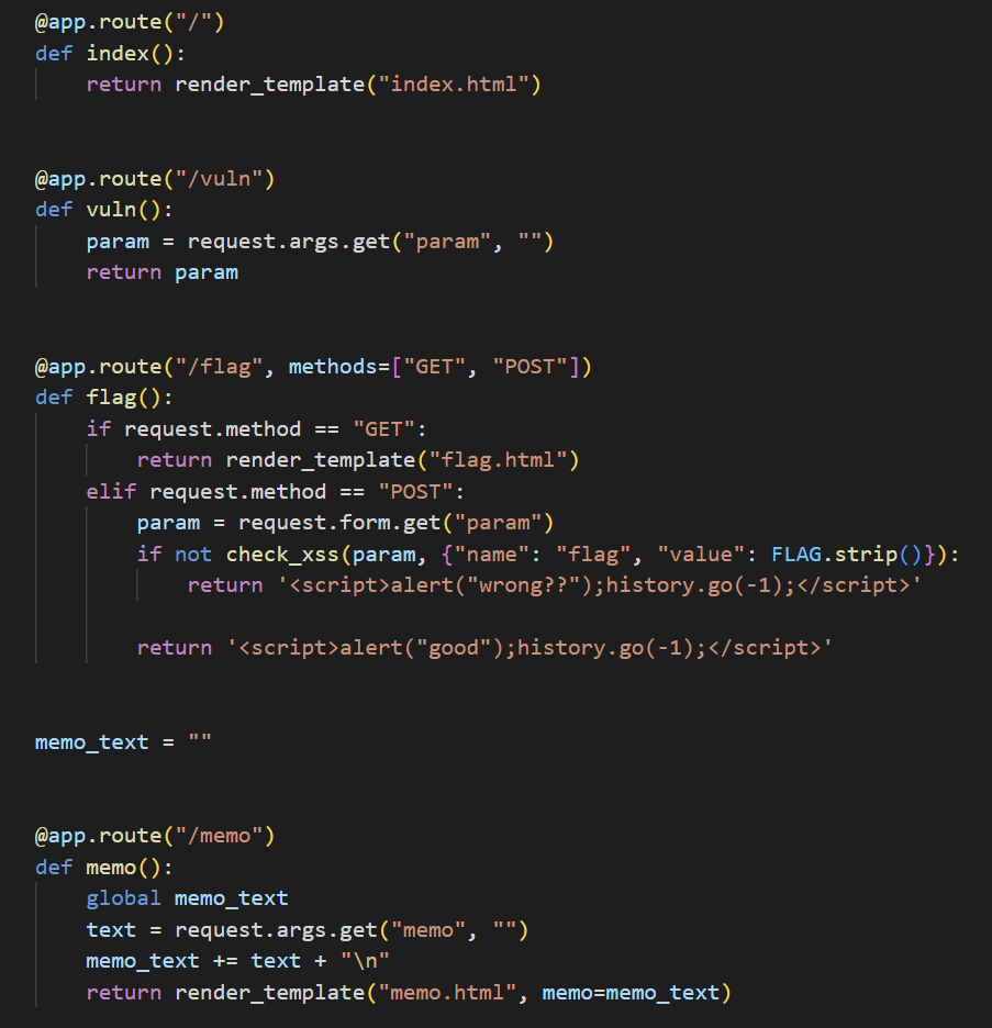 문제에서 XSS 취약점을 이용할 것을 요구했으니 app.route를 살펴봤다.