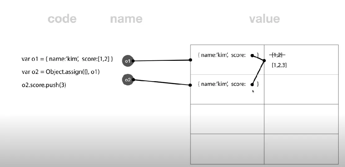 Object.assign( {}, o1 )을 통해서 빈 객체와 o1이란 이름을 가진 객체를 병합하여 하나의 객체로 만들게 되면 o1과 같은 값을 복사해서 다른 위치에 저장한다. 따라서 해당 객체 이름이 o2라 했을 때 o2.name=’lee’; 코드를 실행하면 o1의 값은 변하지 않고 o2가 가리키는 메모리 상의 데이터만 변경된다.