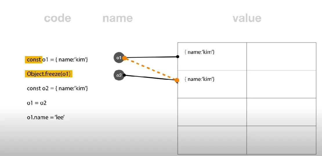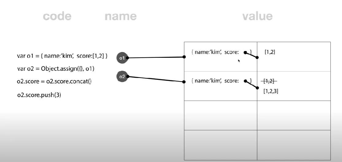 객체 타입은 var o1 = {name: ‘kim’}; var o2=o1; 로 두고 o2.name=’lee’ 를 대입하면 새 메모리 공간을 가리키게 되는 것이 아니라 기존 공간에 있던 데이터가 변경되는 것이다.