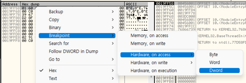 우클릭하여 BP를 걸어주면 된다. 이때 Dword는 4바이트 인데 메모리 크기를 4바이트로 지정한다 라는 뜻이다.