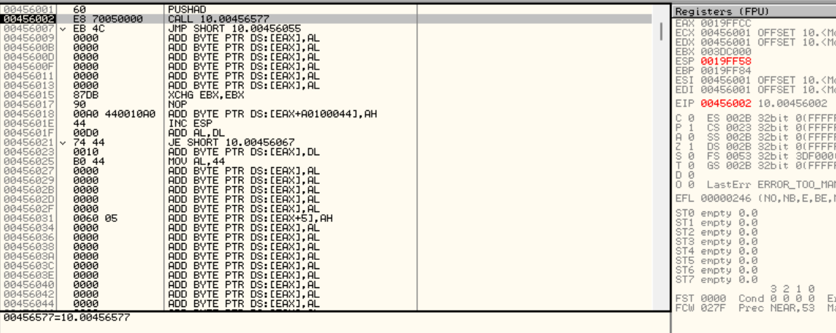 F8을 이용해 PUSHAD 한 줄만 실행시킨다.