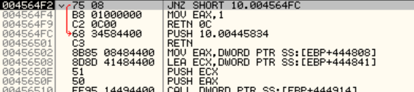 명령어를 살펴보면 JNZ 구문에 의해 분기문이 시작되고 PUSH 명령어로 00445834 주소를 스택에 저장한 후, RETN 명령이 실행되는 것을 알 수 있다.