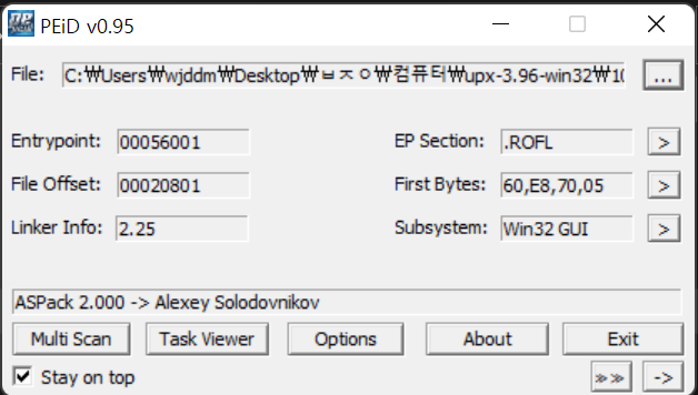 PEiD로 확인해 보니 ASPack으로 패킹되었다고 뜬다.