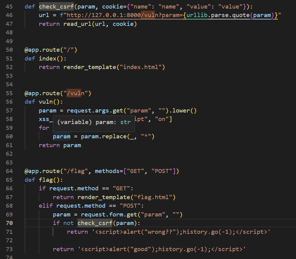 flag 페이지에서 값을 입력 받고 check_csrf 함수를 호출한다.