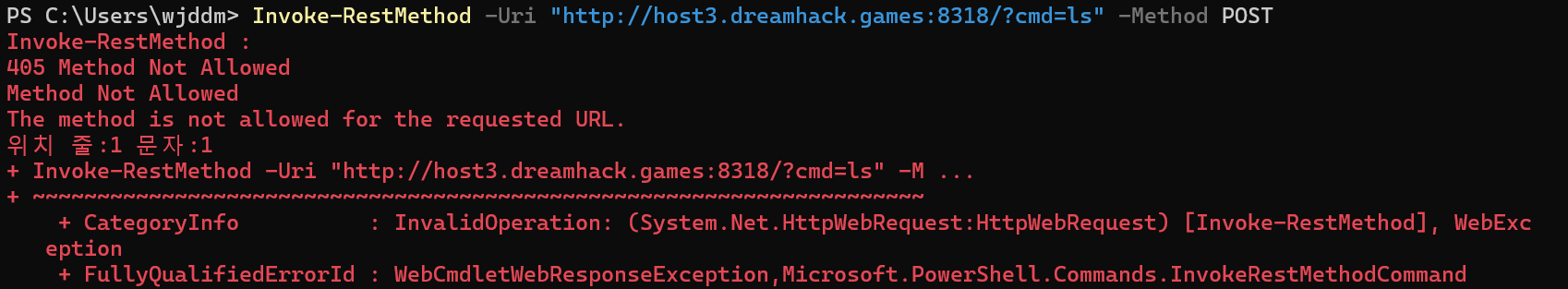 이제 curl 명령어로 드림핵 기능으로 생성한 웹 서버에 POST 메소드로 ls 명령어를 실행해 보자.