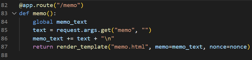 memo는 render_template 함수를 통해 memo.html을 렌더링하는데, 이 함수는 전달받은 템플릿 변수를 HTML 엔티티 코드로 변환하여 저장하기 때문에 memo 페이지에서 XSS 취약점이 발생하지 않는다.
