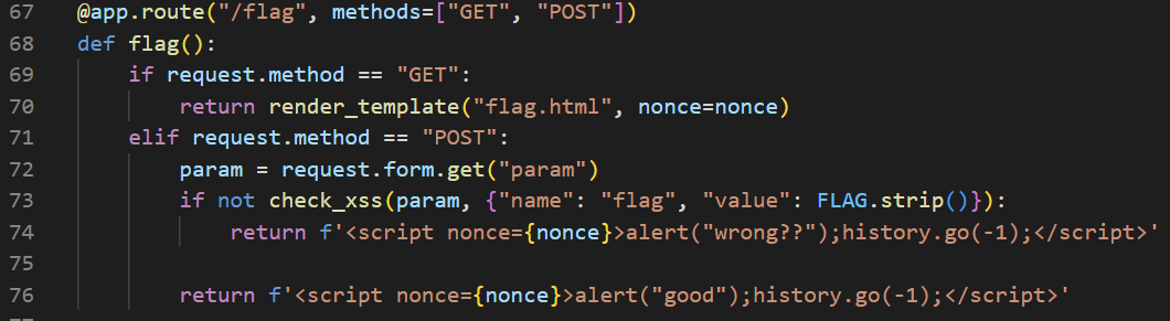 받은 param 값을 render_template("vuln.html", param=param, nonce=nonce)를 통해 vuln.html 템플릿에 전달하여 렌더링한다.