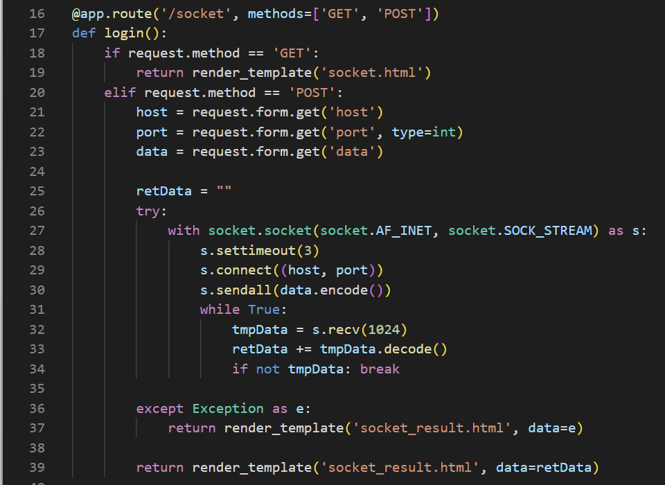 20. elif 문을 보면 클라이언트 측 메서드가 POST라면, 앞서 살펴본 페이지에서 입력한 값들을 host, port, data에 저장한다.
