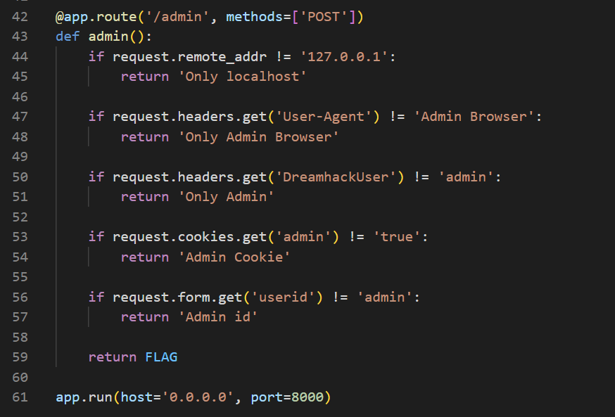 /admin 에서는 조건문에 걸리지 않으면 FLAG 값을 띄운다.