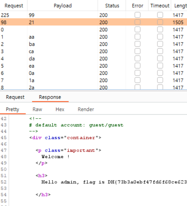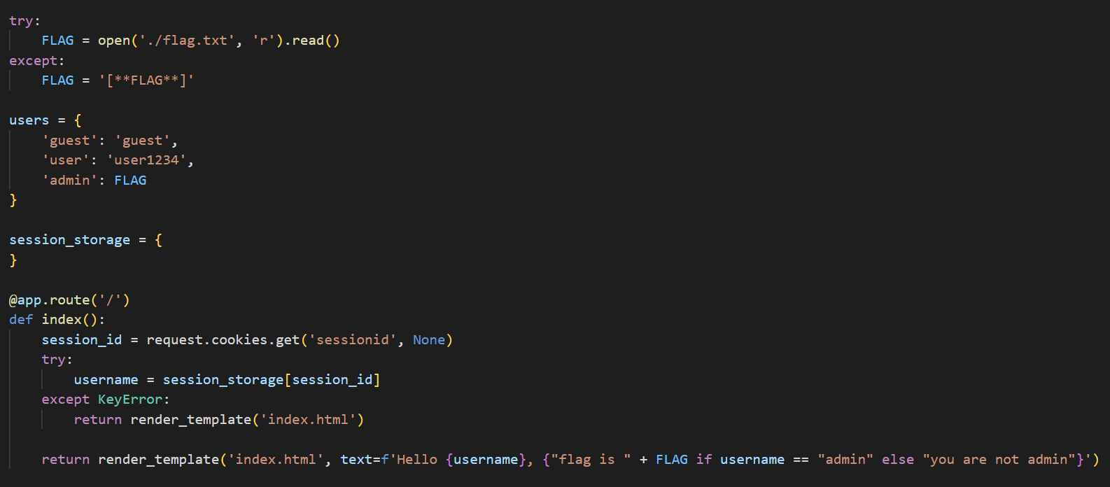 코드 상단을 살펴 보면 users에 guest와 user의 아이디 패스워드는 있는데 admin의 pw는 FLAG로, 공개되지 않았다.