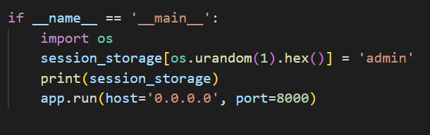 근데 admin의 session은 메인함수에서 os.urandom(1).hex() 이 코드로 hex 값을 랜덤으로 뽑아서 정의된다는 걸 알 수 있다.