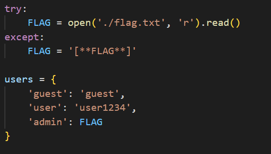 접속 정보 URL로 접속하면 뻔한 login 화면이 있다. 코드부터 살펴 보자 우선 quest의 id, pw가 보이지만 admin의 pw는 FLAG로 txt 파일에서 읽어들이는 거라 지금으로썬 알 수 없다. admin으로 로그인을 성