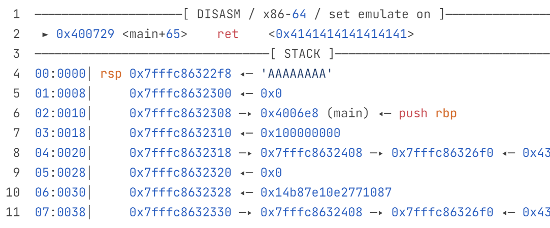 이 값이 AAAAAAAAA가 아니라 원하는 코드의 주소가 되도록 입력값을 주입한다면 원하는 코드가 실행되도록 조작할 수 있다.