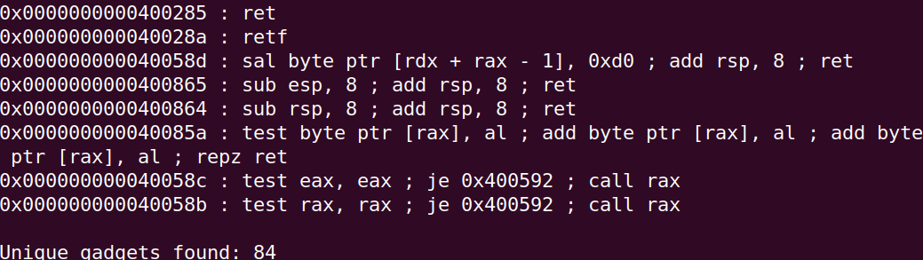 pwntools 설치 시 함께 설치되는 ROPgadget 명령어를 사용해서 다음과 같이 가젯을 구할 수 있다.