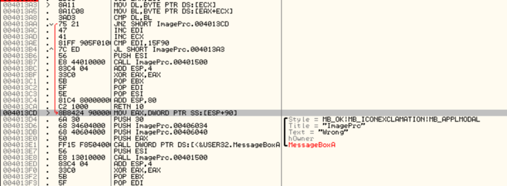 보니까 Wrong 메세지 박스를 띄우기 전에 어떤 분기문에 의해 점프한 것을 볼 수 있다.