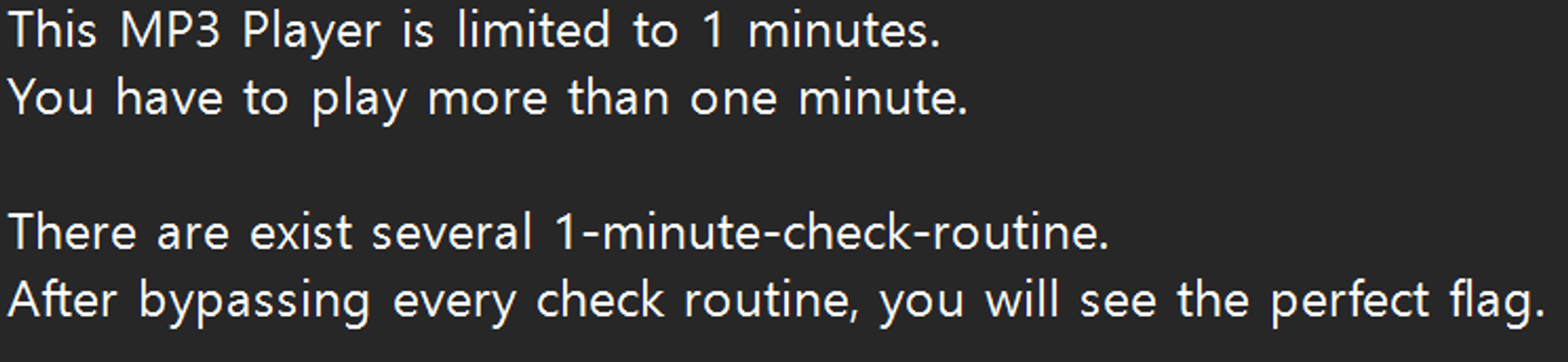 1분 재생만 되는 MP3 Player를 1분 이상 재생시켜서 flag를 얻어야 한다.