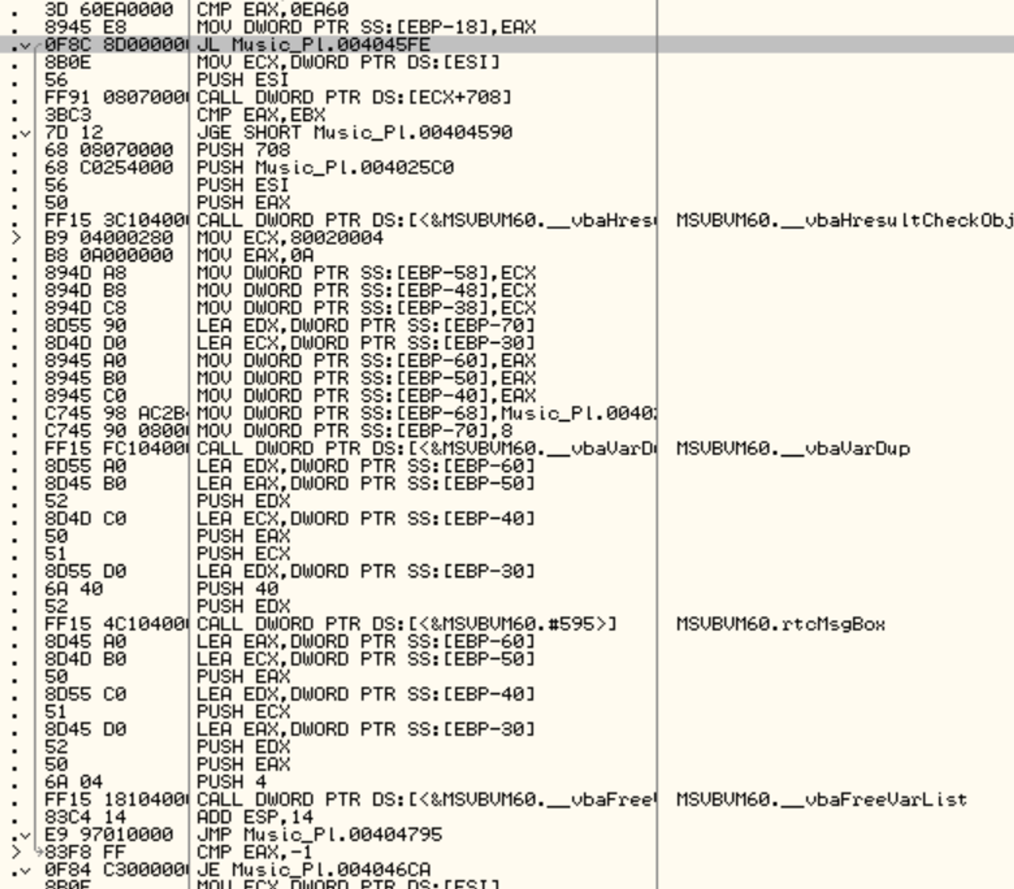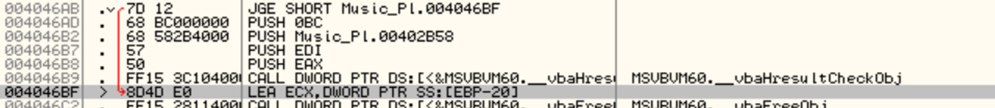이 에러를 살펴 보기 위해 콜스택을 보면 004046BF가 호출된 후 에러가 발생한다고 한다.