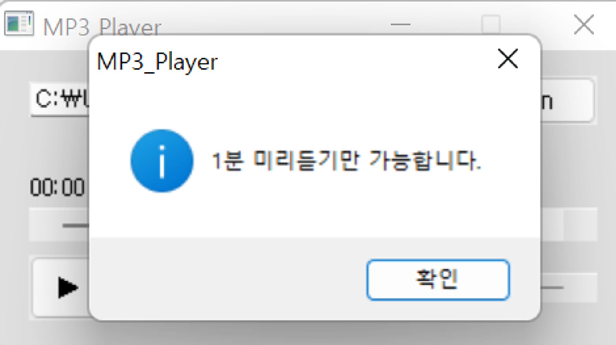 프로그램을 실행시켜서 원하는 MP3 파일을 열었더니 1분이 됐을 때 팝업창이 떴다.