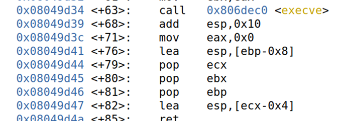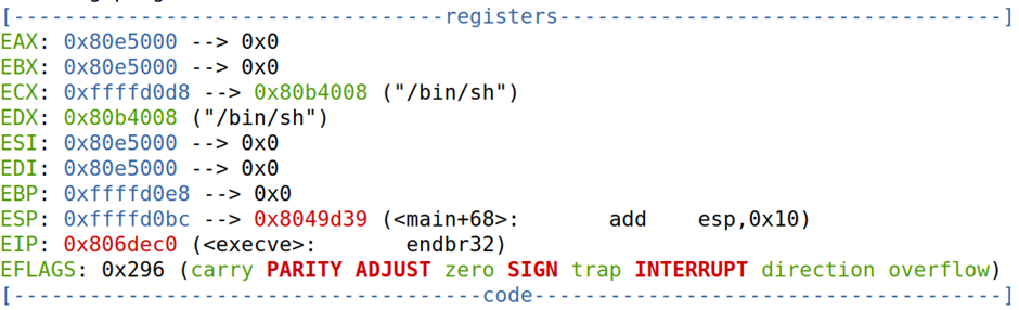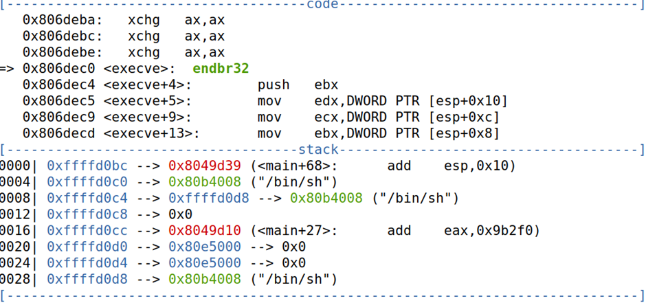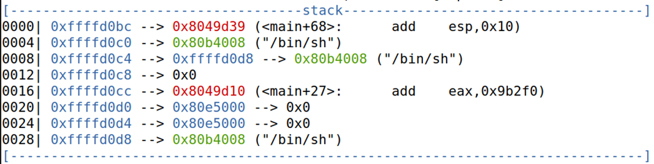 해당 주소는 /bin/sh 문자열이 들어있는 주소, /bin/sh 문자열, 0 값을 가리키고 있다.