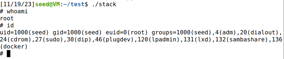 - sudo chmod 4775 stack : setuid 프로그램으로 만든다.