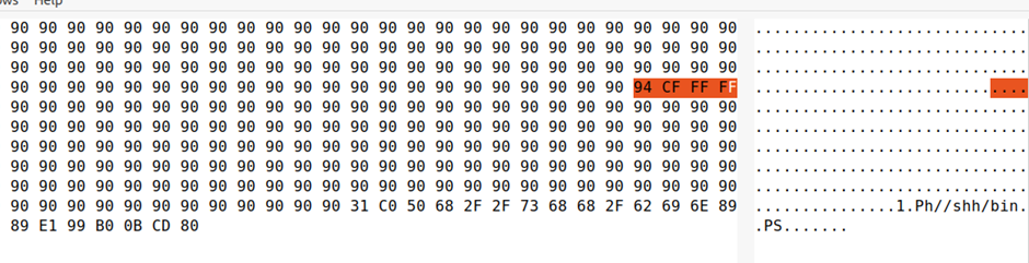 NOP 명령어 반복 끝에 쉘 코드도 잘 삽입 되어 있다.