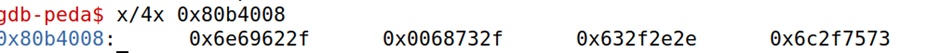 해당 주소는 /bin/sh 문자열이 들어있는 주소, /bin/sh 문자열, 0 값을 가리키고 있다.