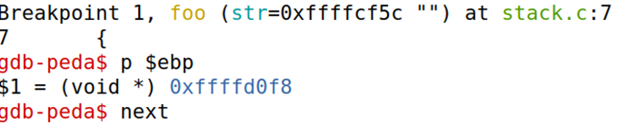 next 명령어로 한 줄 실행하여 foo에 진입한 뒤 ebp 값을 알아야 한다.
