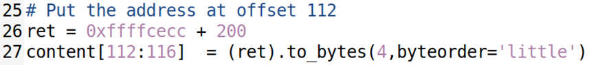 E. ret: 반환 주소를 조작하기 위한 값이다. 현재는 하드코딩되어 있으며, 주석에서 주어진 주소(0xffffcecc)에서 200바이트 앞으로 이동한 값을 사용하고 있다. 이때, 스택 주소인 0xffffcecc는 설정에 따라 랜덤이 될 수 있고 운영체제마다 다르게 주어질 수 있으니 gdb에서 확인해야 한다. (이는 아래에서 설명할 예정이다.)