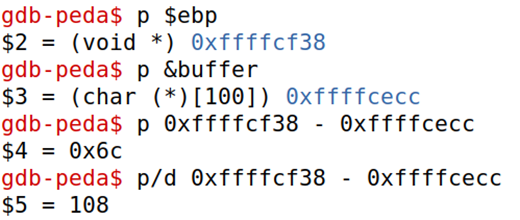 ebp와 buffer의 사이는 decimal 값으로 108 차이가 난다.