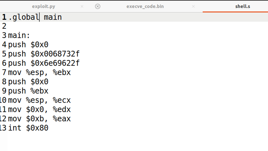 A. shellcode: 이 부분은 셸 코드를 나타냅니다. 각각의 \x로 시작하는 16진수는 해당하는 어셈블리 명령을 나타낸다. 주로 /bin/sh를 실행하는 역할을 한다.