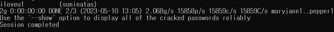3. cmd 창을 켜서 해당 파일로 이동한 후(cd 명령어 이용) john shadow(원하는 파일)을 입력한다.