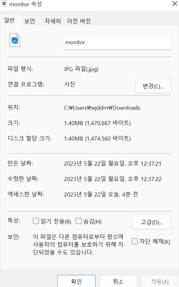 이미지를 다운받아서 속성을 먼저 살펴 보았다.