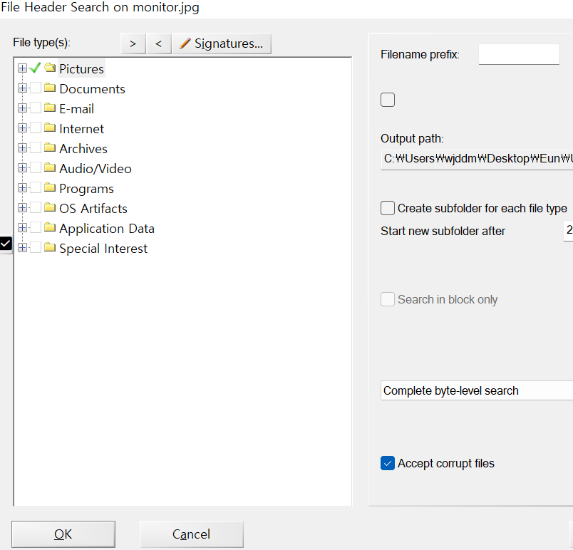 그리고 Complete byte-level search로 설정해 줘야지만 제대로 카빙이 된다.