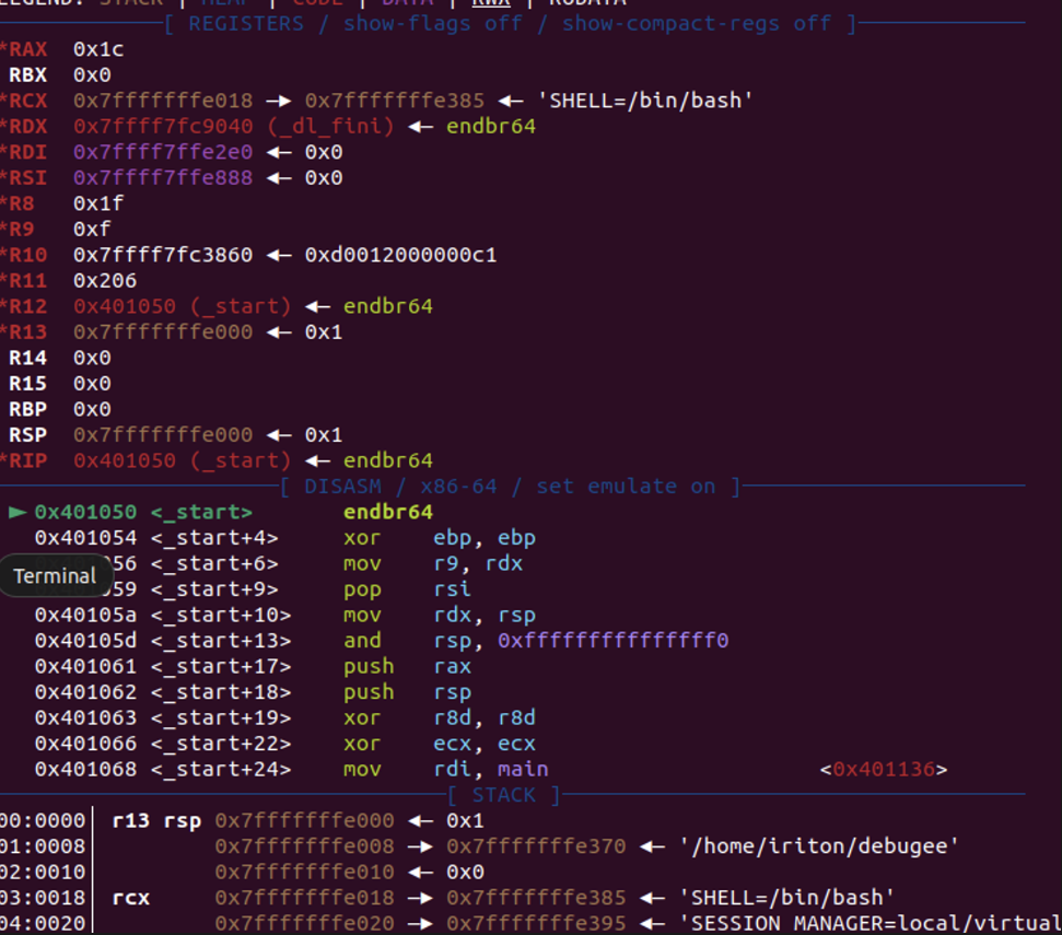 디버거로 debugee 파일을 연다. 그럼 pwndbg가 자동으로 실행된다.
