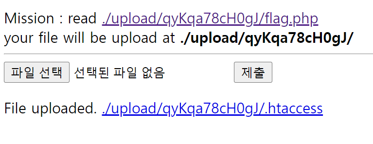 .htaccess 파일을 업로드 하여서 flag.php 파일의 설정을 바꿔야 한댔다.