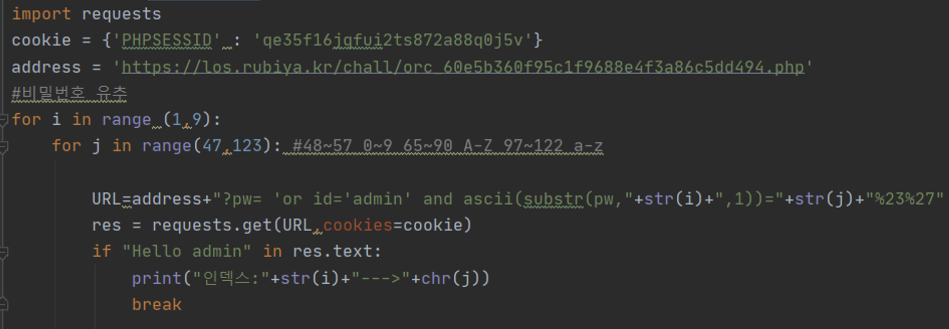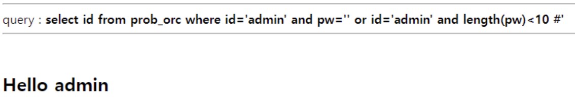 쿼리문에 ?pw=' or id='admin' and length(pw)<10 %23 을 입력하여 앞의 판별은 무시하고
